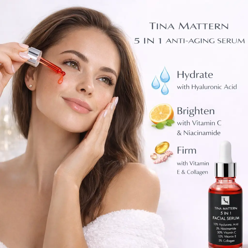 Tina Mattern 5-in-1 Facial Serum is a multi-active anti-aging formula designed to hydrate, brighten, and firm the skin. This advanced serum delivers visible results by combining powerful, skin-loving ingredients into one simple step.