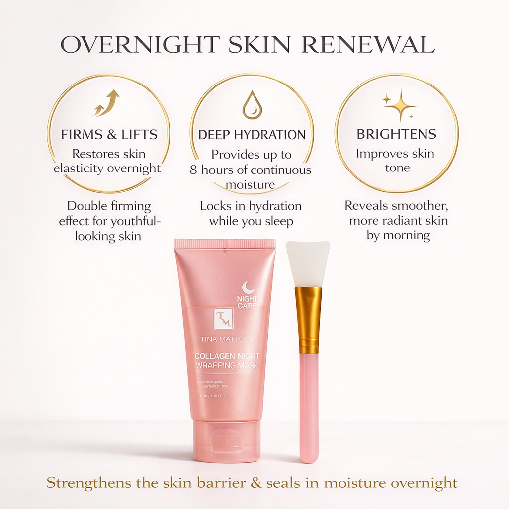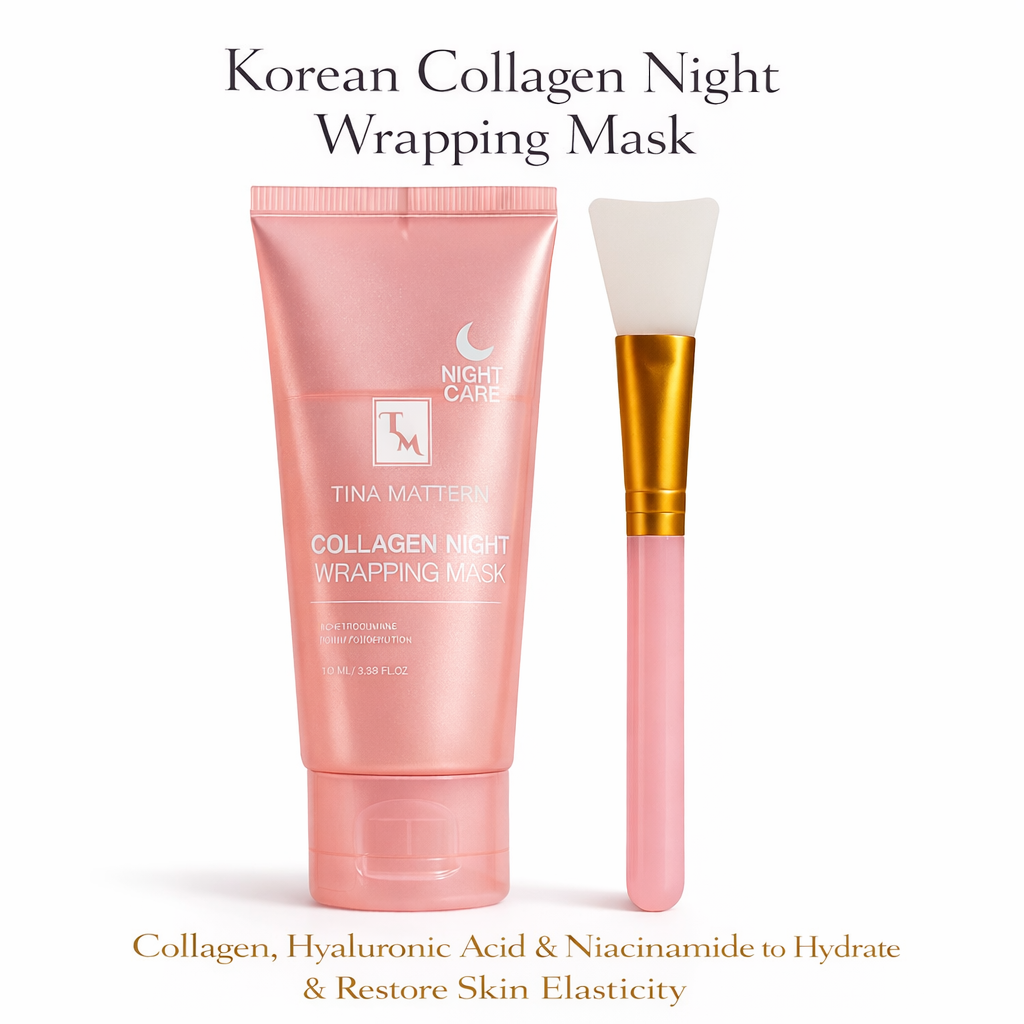 Experience intense overnight hydration and skin restoration with the Tina Mattern Korean Collagen Night Wrapping Mask. Designed for nighttime care, this mask works for up to 8 hours while you sleep, repairing skin elasticity and delivering deep hydration. The formula locks in moisture, leaving skin bright, supple, and firmer by morning.