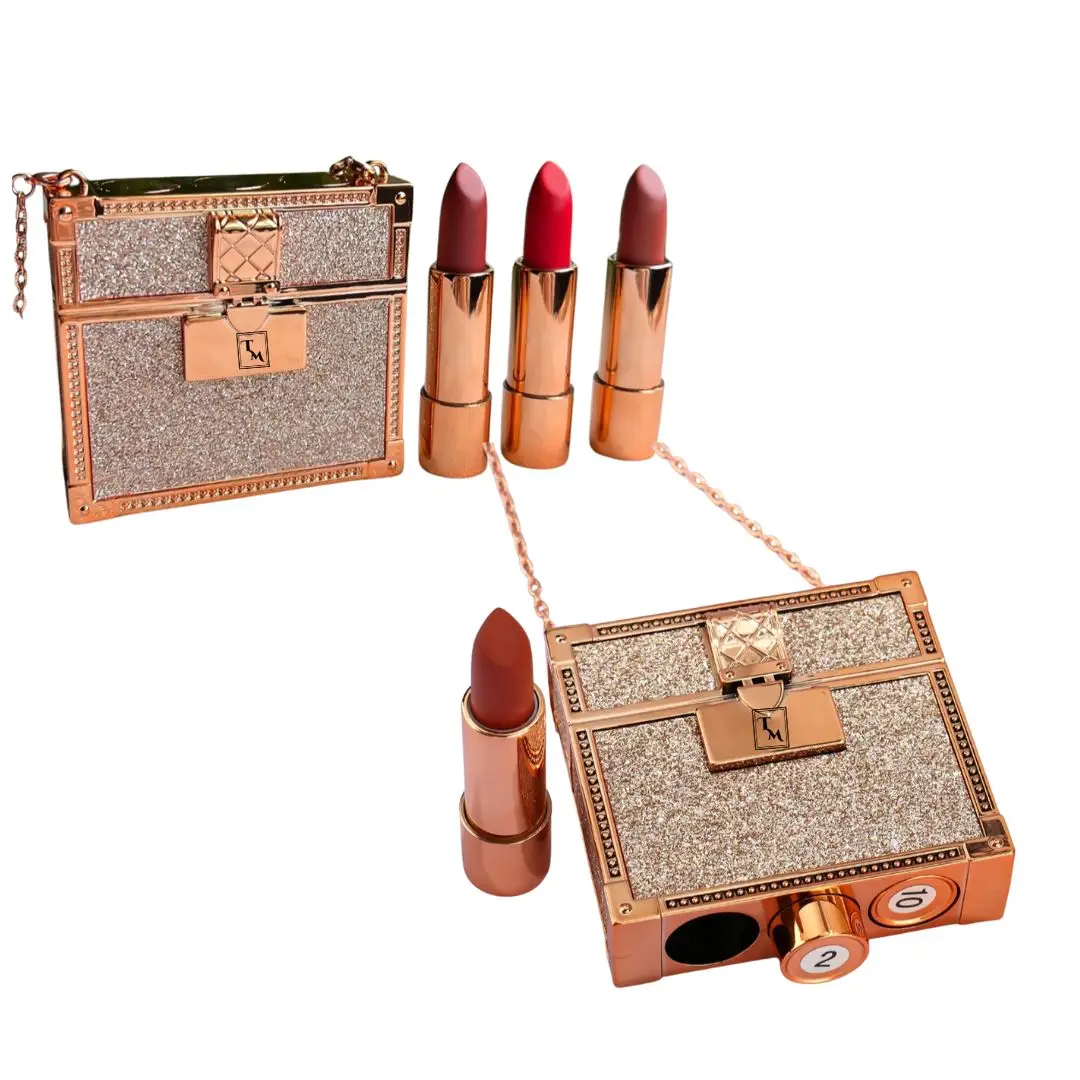 Tina Mattern Matte Lipstick 3-Piece Set. This stunning set features three rich, velvety matte lipsticks in wearable, high-pigment shades—perfect for day to night. Packaged in a sparkling rose gold bag with a push-to-release clasp and chain strap, this set doubles as a statement accessory.