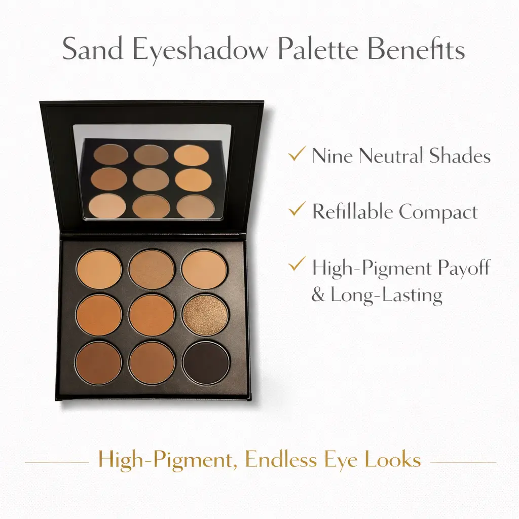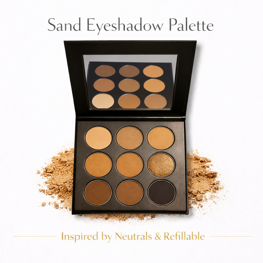 Sand Eyeshadow Palette with nine neutral refillable high-pigment shades in sleek black compact